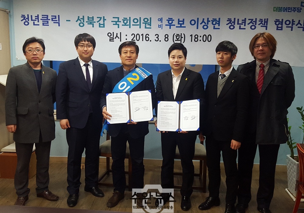 [수완뉴스=국회(더불어민주당),서울]정치사회팀,8일 더불어민주당 성북갑 지역에서 뛰고 있는 이상현 예비후보가 ‘청년문제 해결사’를 다짐하며 청년클릭 이수영 청년정책협약추진위원장과 함께 정책협약식을 가졌다.