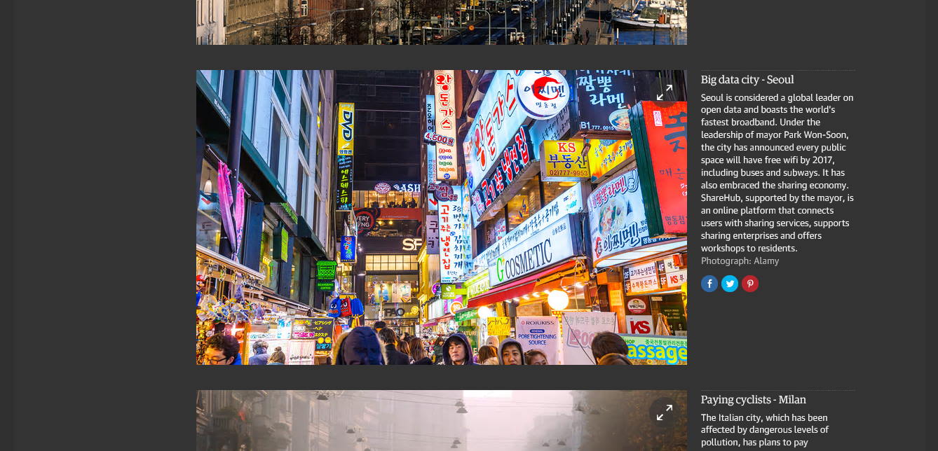 가디언 지는 서울에 대해서 “데이터의 선두 도시이자 세계에서 가장 빠른 초고속 인터넷망을 자랑하는 도시”로 소개하고 “17년까지 버스와 지하철을 포함한 공공지역 전역에 무료 와이파이를 보급한다는 내용의 정책도 함께 내보냈다. 또한 서울시의 공유경제를 언급하며 사용자와 공유 서비스를 연결하고 공유기업들을 지원하는 서울시의 ‘공유허브’를 소개하였다.