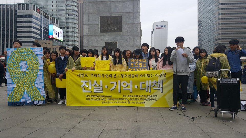 [수완뉴스=서울] 박주민 기자, 16일, 청소년행동’여명’, 21세기 청소년공동체’희망’, 무지개빛청개구리, 공간민들레, 안곡고등학교 역사탐방동아리 ‘한’, 오산청소년행동 등의 단체가 공동으로 오후 3시 광화문 kt 앞에서 “세월호, 우리의 두 번째 봄 : 청소년들의 소리없는 아우성” 이라는 세월호 참사 2주기 추모집회를 열었다.