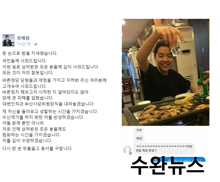 왼쪽 사진은 바른정당 장제원 의원의 페이스북 사과문 (사진=캡쳐)