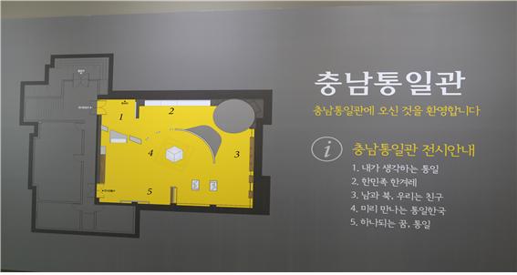 충남 통일관은 지하 2층, 지상 3층으로 이루어져 있으며, 지하 1층에는 북한 물품 전시실로 사용되고 있고, 지상 1층은 통일 전시관으로 사용되고 있다. 지상 전시관은 5개의 주제로 전시되어있다.