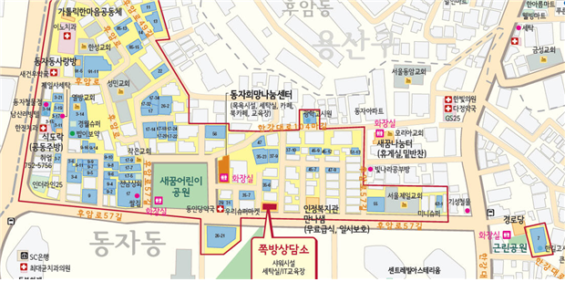 한편 동자희망나눔센터는 서울특별시 용산구 후암로 57길 35-15 지상2층과 반지하1층으로 각각 위치하고 있다. 반지하1층부터 북카페, 주민쉼터 지상1층은 IT카페, 3~ 4인이 들어가 사용할 수 있는 샤워룸이 설치되어 있고 지상2층은 창작공간, 프로그램실, 세탁실이 설치되어 있다.