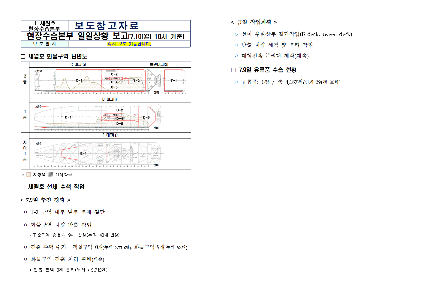 어제 오전 10시, 오후 17시 세월호 선체 조사 일일상황 보고