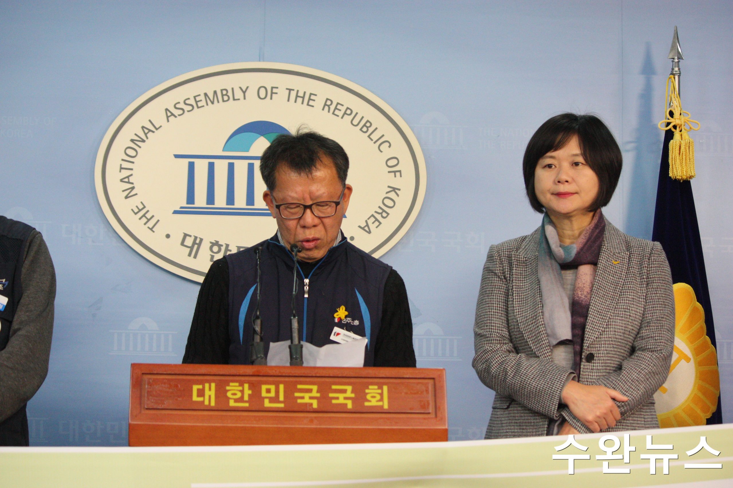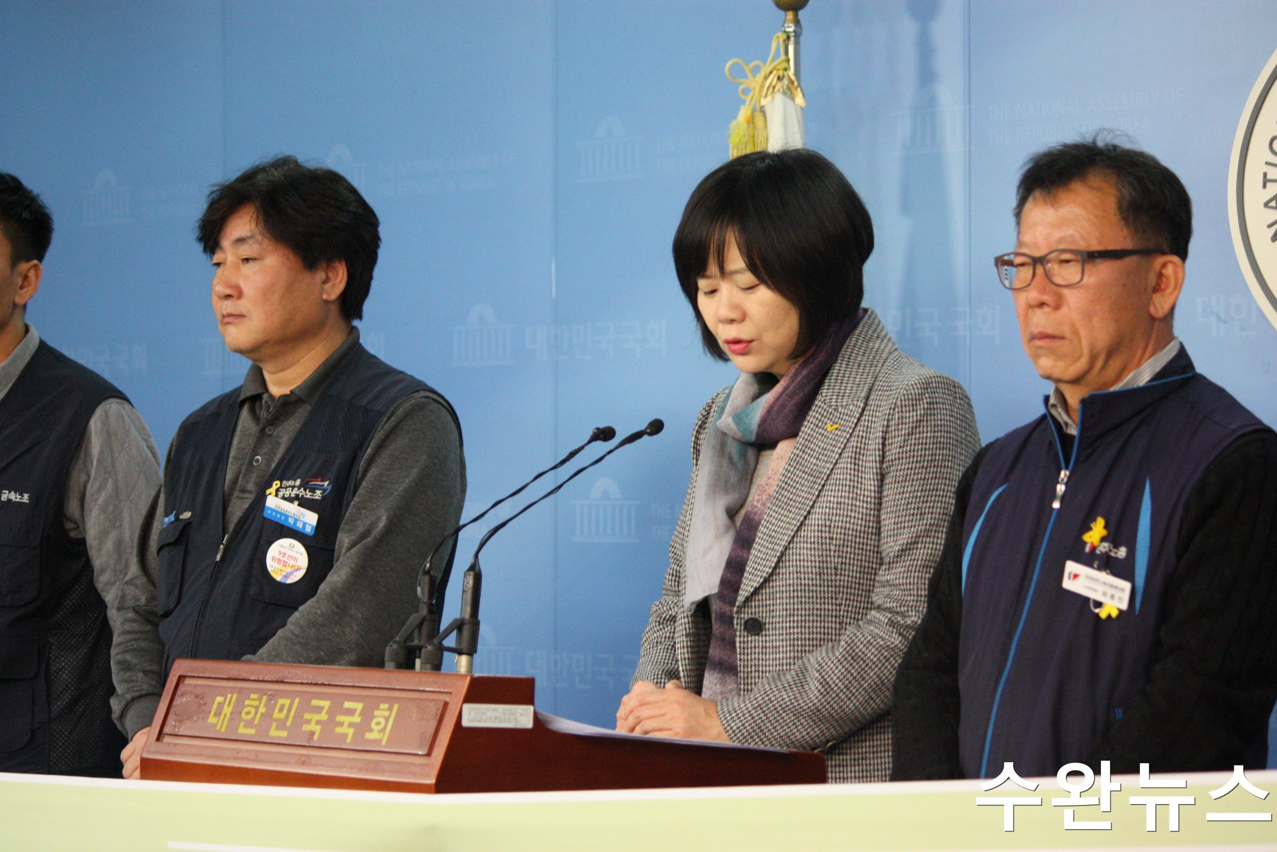 [수완뉴스=정론관, 기자회견장] 오늘 (16일) 전국민주노동조합총연맹과 정의당 이정미 대표가 근로시간면제제도 폐지 및 교섭창구단일화 폐지, 공공부문 쟁의권보장에 대한 국제기준에 맞는 노조할 권리 입법 추진안 발표 기자회견을 국회 정론관에서 가졌다.