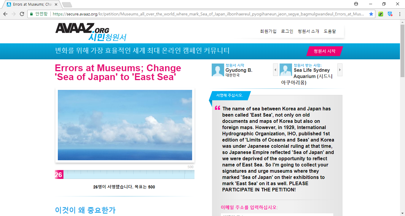 청원인: 몇년 전 호주 시드니 아쿠아리움을 방문했는데 지도에 동해 (East Sea)는 없고 일본해 (Sea of Japan)이 단독 표기되어 있었습니다. 또한 다른 외국 박물관들에 한자로 일본해가 단독 표기되어있는 것을 보았습니다. 이에 두 군데에 항의서한을 보냈지만 답변을 받지 못했고, 여러 사람의 힘이 모이면 시정될 수도 있지 않을까라는 생각에 일본해를 단독 표기하고 있는 그 두 곳과 다른 몇 군데의 박물관을 상대로 청원을 진행하기로 결심했습니다.`
