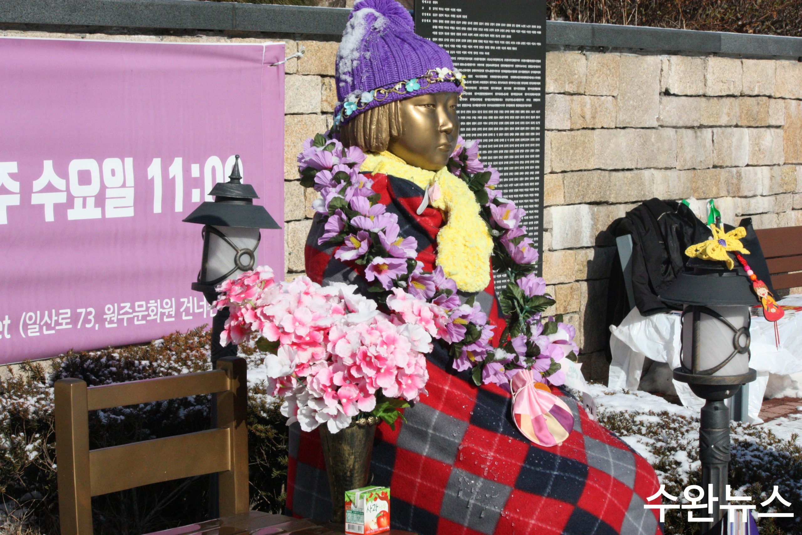 [수완뉴스=원주시청] 2018년 1월 10일 원주시청 앞에 설치되어 있는 평화의 소녀상, 원주 평화의 소녀상은 국내에서는 처음으로 세워진 위안부 소녀상으로, 소녀상의 관리와 보호를 위해 인근에 CCTV가 설치되어 있다. / 원주 평화의 소녀상 설치를 위해 세워진 범국민위원회 명예회장으로 원주시 원창묵 시장이 등재되어 있다.