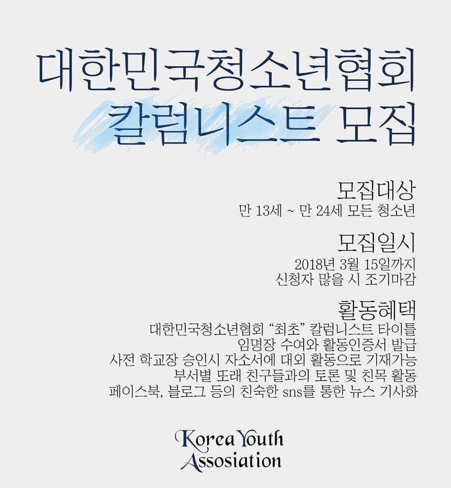 [수완뉴스=청소년] 김동주, 대한민국청소년협회에서 청소년의 관점에서 칼럼(기사)를 작성할 제1대 칼럼리스트를 2018년 3월 15일부터 모집한다. 모집대상은 글쓰기를 좋아하고 사회에 할 말 많은 만 13세~ 만 24세의 청소년들이며, 지원자가 많을 시 조기마감될 수 있다고 한다.