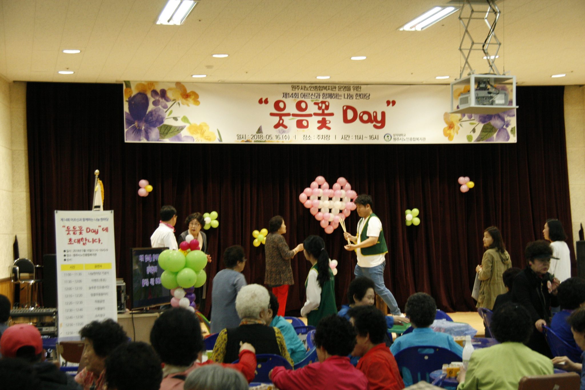 [수완뉴스=원주 노인복지회관] 김동주 기자, 오늘 16일, 오전 11시 부터 원주 노인복지회관 본관 2층에서는 어르신, 관계자 포함 약 500여명이 참가하는 행사로서, 원주지역 학생들, 시민 등이 자원봉사로 참여하며, 공연, 노래자랑, 물품판매, 먹거리장터 등 다채로운 행사가 열렸다.