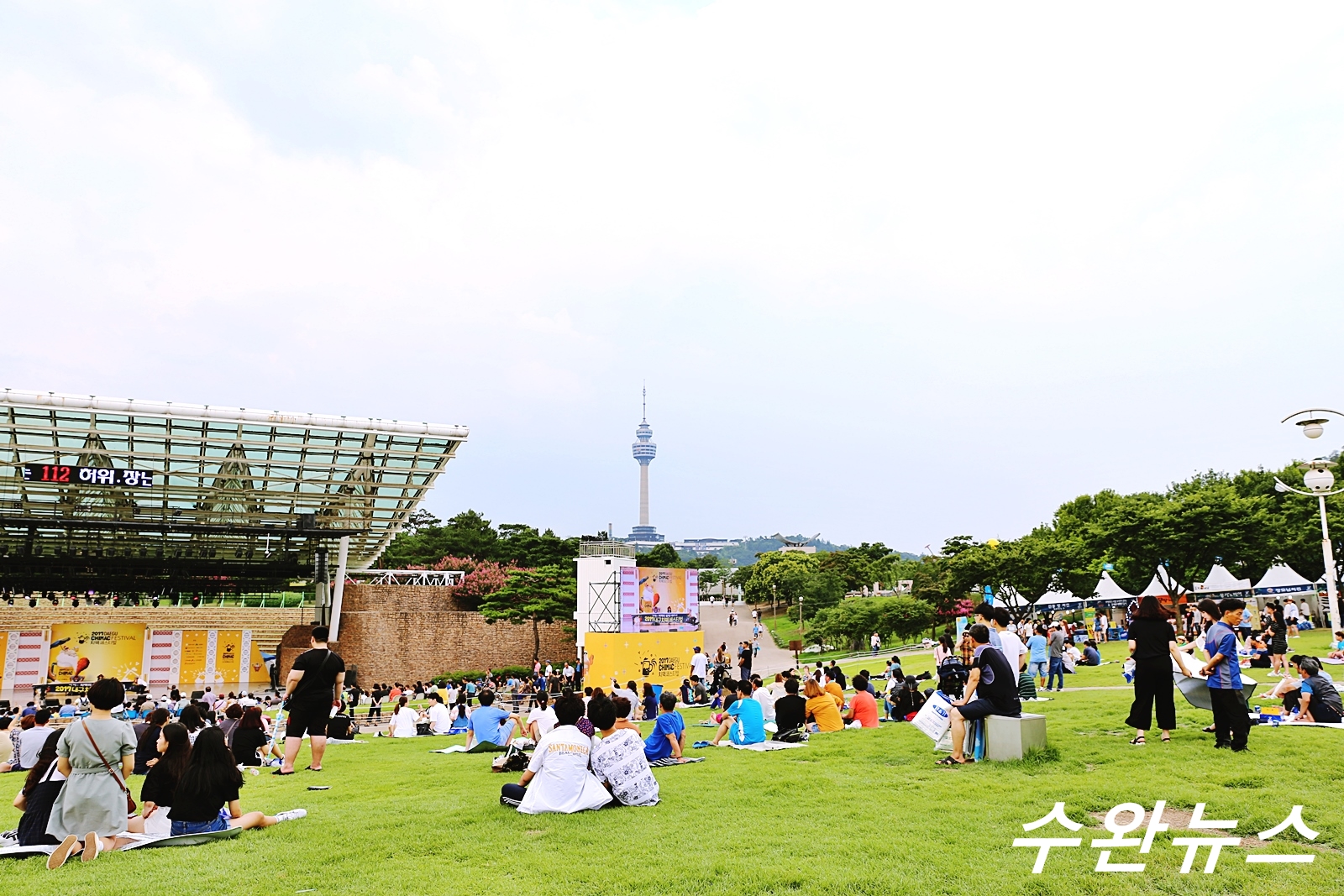 2017년, 치맥 페스티벌이 본격적으로 시작되기 전부터 사람들로 북적거렸다. 잔디밭에 앉아야하기 때문에 돗자리는 개인 필참이다. 나중엔 이 잔디밭 광장이 발 딛을 틈 없을 정도로 빼곡이 채워진다.