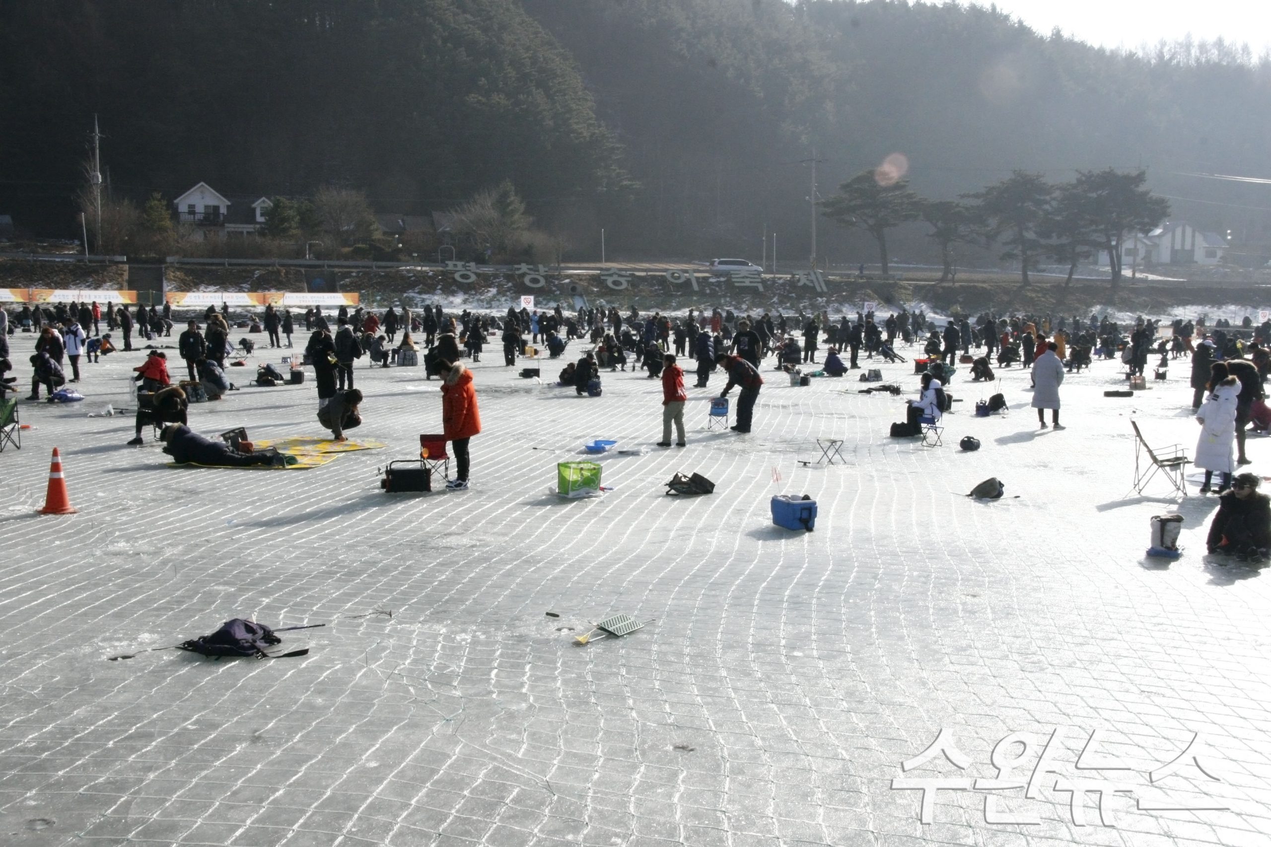 [수완뉴스=김동주 기자] 22일, 평창군 진부면 진부공용버스터미널 앞 오대천둔치에서 제 22회 평창송어축제가 열려, 많은 시민들이 얼음 송어 낚시를 즐기고 있다.