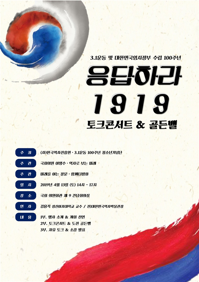 사단법인 한국역사진흥원과 3.1운동 100주년 청소년 기념단이 공동으로 주최하고 국회의원 이명수, 역사로 보는 미래(대표 김태훈)이 공동으로 주관하는 이번 행사는 총 3부로, 1부는 행사 소개, 개회 선언, 2부는 토크콘서트, 골든벨 (주제 : 100년전의 오늘), 3부는 자유토론, 소감발표로 이루어져 있다. 이번 행사의 연사는 김용직 성신여대 교수가 나선다.