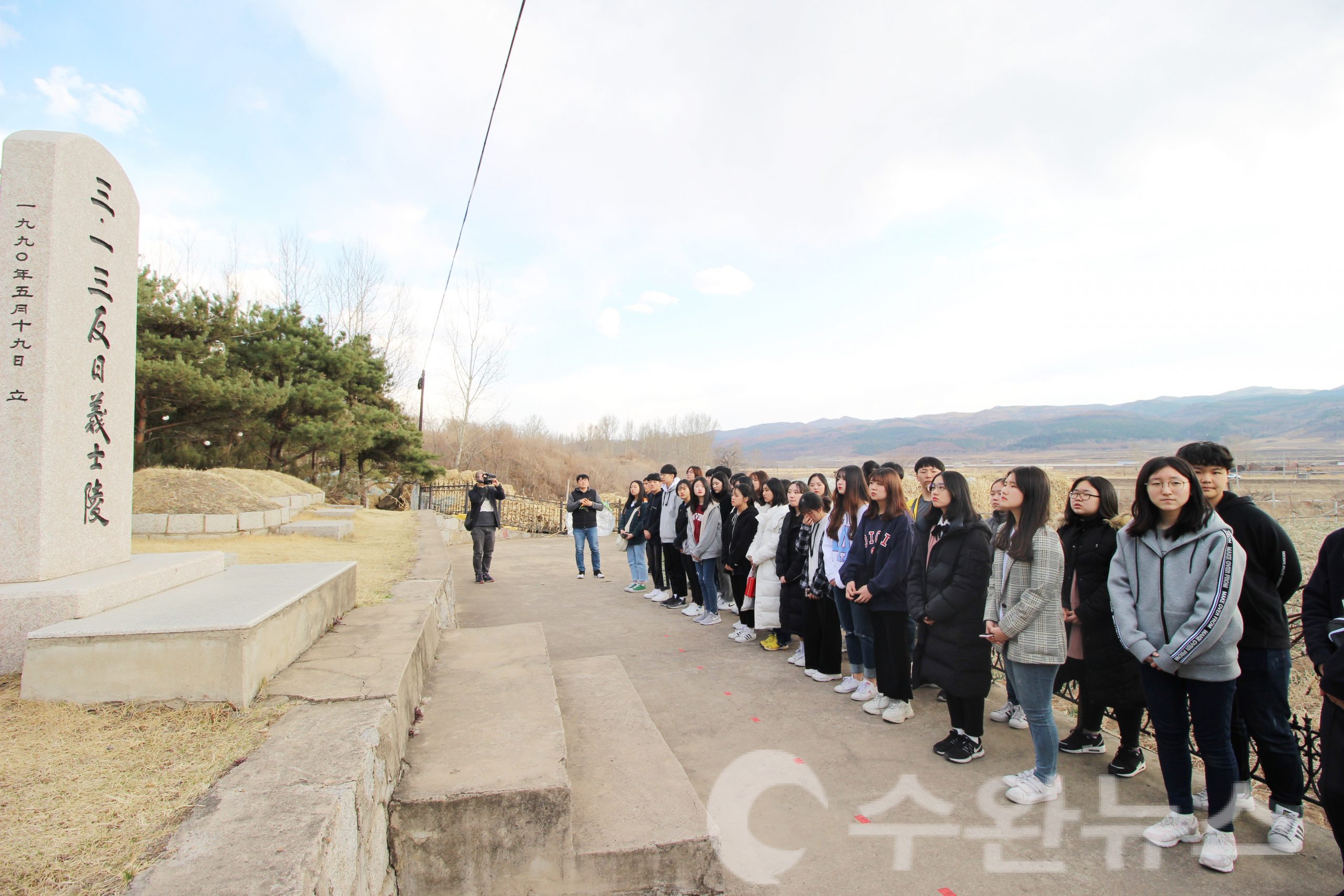 [수완뉴스=송태훈 사진기자] 경기 학생 대표 33인은 3.1운동 임시정부수립 100주년을 기념하여, 지난 8일부터 13일까지 중국 연길과 연변 지역에서 백두산과 3.13 반일의사릉, 두만강변, 윤동주생가, 명동학교등 독립운동 유적지들을 탐방했다.