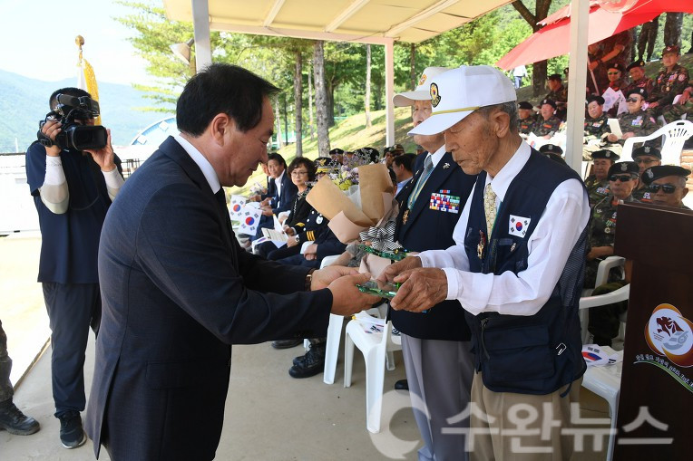 [수완뉴스=평창] 25일, 평창군은 6.25전쟁 69주년을 맞아 1670부대 3대대에서 6.25전쟁 69주년 기념행사를 개최했다. 이번 행사에서는 각급 기관ㆍ사회단체장 및 6.25참전유공자 회원 등 150여 명이 참석한 가운데 식전공연으로 태권도 시범과 함께 부대소개 영상, 국민의례, 유공자표창, 기념사, 회고사, 격려사, 6.25노래 제창으로 보다 의미 있고 다채롭게 진행되었다. 그리고 1670부대 109연대장과 3대대장의 적극적인 협조로 평창군에서는 처음으로 부대를 방문하여 행사를 추진하게 되었다.