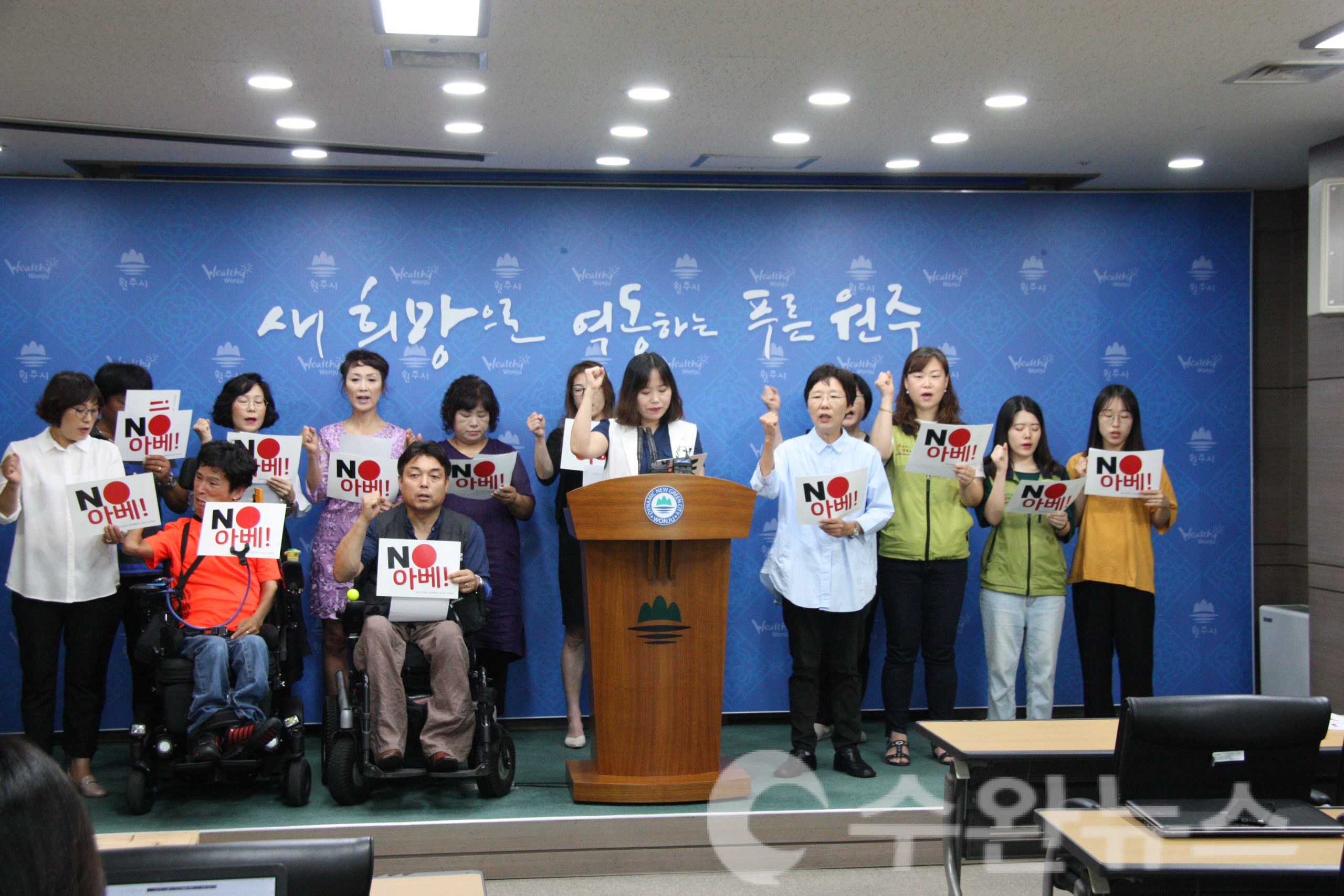 12일 오전11시, 원주시청 브리핑룸에서 원주시민연대, 원주여성민우회 등 여성인권 관련 원주인권네트워크에서 한국에 대한 일본의 경제보복과 위안부 인권유린, 역사왜곡에 대한 규탄 기자회견을 열었다.