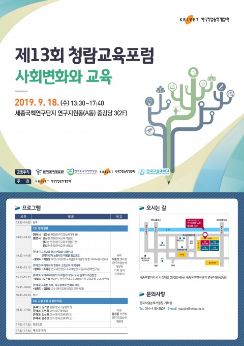 [수완뉴스=세종시] 한국직업능력개발원은 18일(수) 오후 2시부터 5시 30분까지 세종국책연구단지 연구지원동 중강당에서 ‘사회변화와 교육’을 주제로 제13회 청람교육포럼을 개최한다.