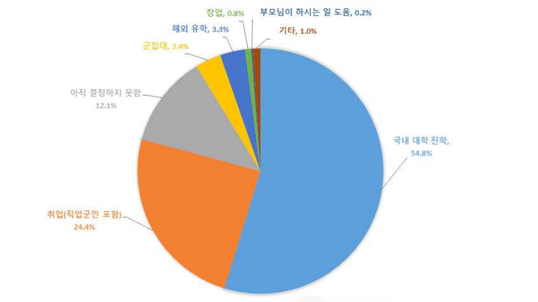 이 때, 부모의 학력이 높고, 가구소득수준이 높을수록 국내 대학에 진학하겠다는 응답비율이 더 높은 반면, 부모학력과 가구소득수준이 낮은 경우 취업을 희망하거나 고교졸업 직후 계획의 미결정 수준이 상대적으로 높게 나왔다.