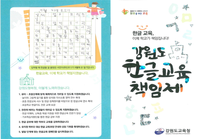이에 대한 자세한 설명으로 △1~2학년 담임교사 전체 대상 한글문해교육 기본과정연수 운영 및 한글교재 제공(5월), △한글해득 현황 조사(6월), △한글교육전문가 초청 강연회(6, 10월, 11월), △교육감 공감 소통 현장방문 한글교육 공개수업 및 학부모, 교사와의 대화(7월), △한글문해교육 심화과정 연수 신설(8월), △한글교육책임제 추진을 위한 학부모, 교원 설문조사(9월), △한글날기념 한글문해교육 포럼 개최(10월), △한글교육 30시간 및 과도한 알림장과 일기 지양 등 강원도초등학교교육과정편성운영지침 개정(10월), △한글문해교육 전문가과정 연수 신설(9~12월), △한글해득 현황 조사 분석(12월), △한글교육 실천사례집 제작(12월)으로서 한글교육 기반 조성에 충실히 다하였다.