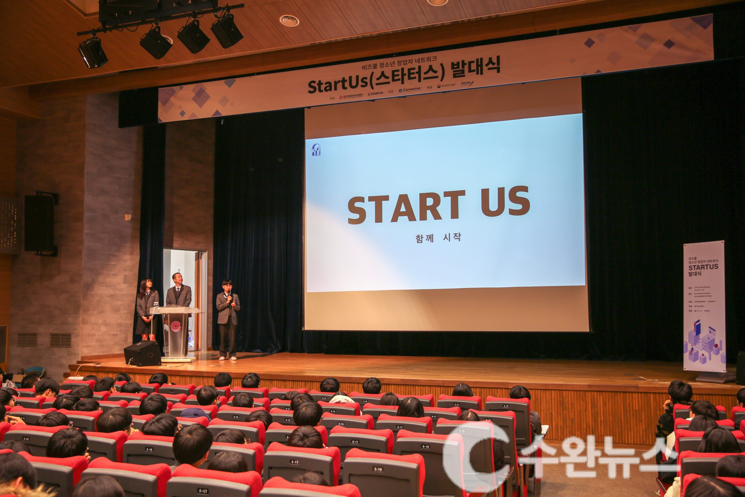 [수완뉴스=커넥션] 지난 16일 청소년 자치단체 커넥션과 비즈쿨 특화학교인 디지털미디어고등학교가 청소년의 창업 저변 확대를 위해 중소벤처기업부와 창업진흥원이 운영하는 청소년 비즈쿨 프로그램의 후원을 받아 『비즈쿨 청소년 창업자 커뮤니티 ‘StartUS(스타터스)’』를 출범했다. 사진은 스타터스 발대식 현장.
