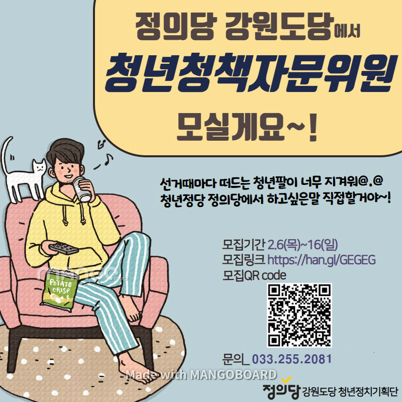 정의당 강원의 청년정책자문위원은 강원도에 거주하는 만 35세 이하 청년을 대상으로 하며, 오늘 6일부터 오는 16일까지 온라인(https://han.gl/GEGEG)을 통해 모집한다.