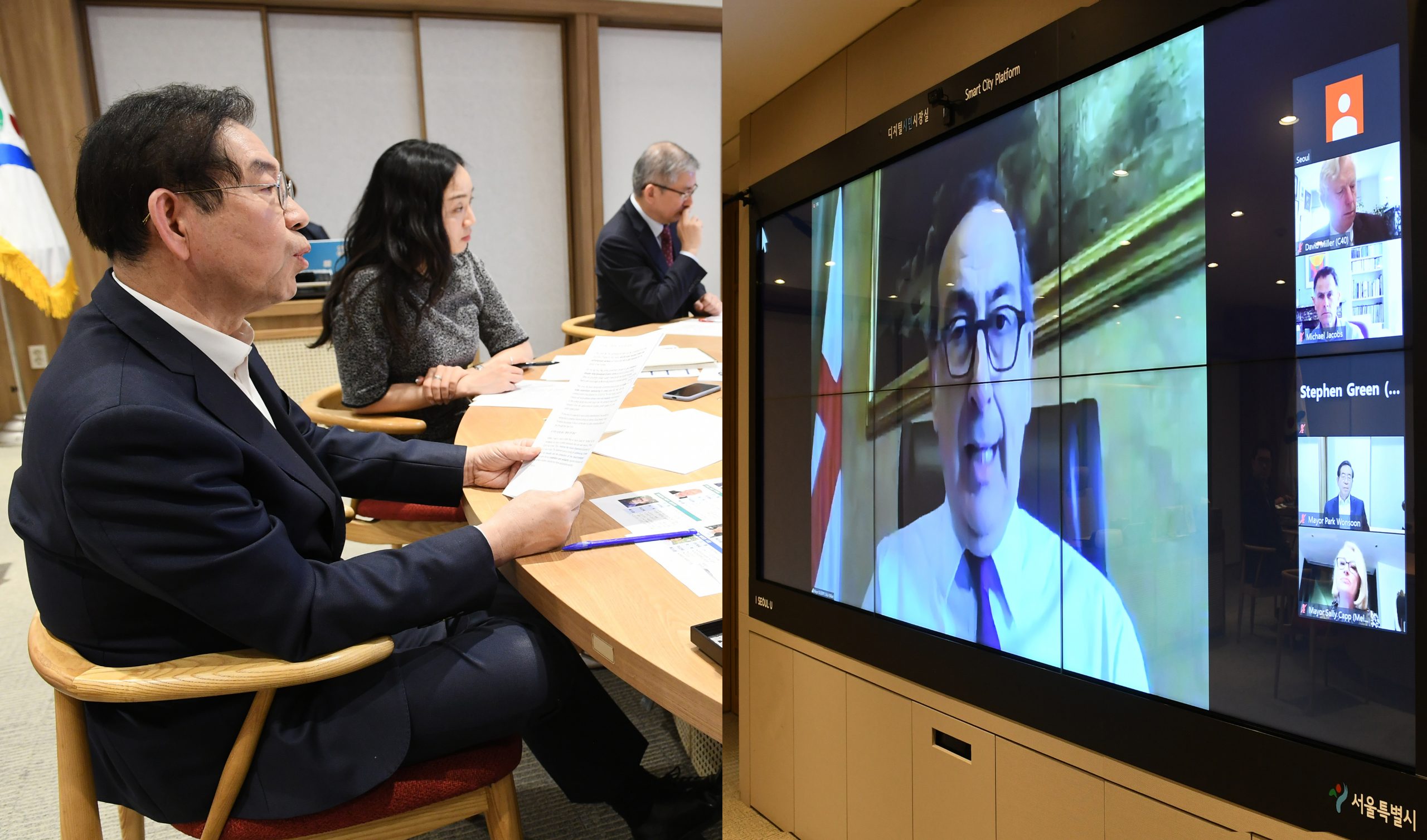 이탈리아 밀라노 시장(주사페 살라, Giuseppe Sala)이 주재한 이번 회의는 시애틀과 몬트리올 등 각 지역을 대표한 10개국 10개 도시 시장 등이 참여했으며 이 날 23시 화상회의로 진행됐다. C40 부의장으로 활약하고 있는 박 시장은 시장 집무실에서 1시간 반 동안 회의에 참가하였다.