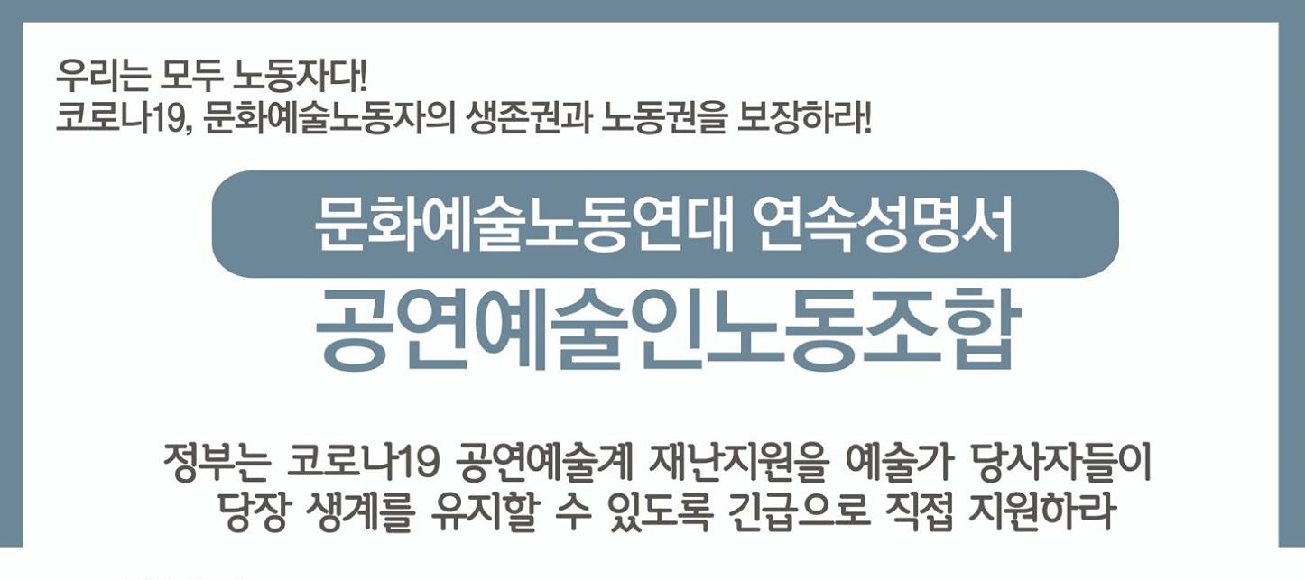 문화예술노동연대에서 모든 문화예술 노동자들의 생존권과 노동권을 촉구하는 서명서를 공개했다. 이날 서명서에는 게임, 영화, 출판, 공연예술 등 다양한 문화예술 분야의 노동자들이 연속성명서를 발표했다.