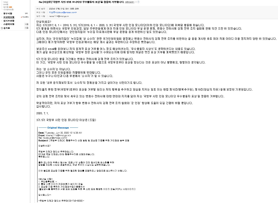 이씨는 국방부 인권과에 포상 거부를 알리는 이메일에서 “자신은 ‘성 소수자’는 아니지만, 군의 모든 인권침해와 차별행위에 반대하고 사람은 누구나 타인과 다른 부분에서 ‘소수자’가 될 수 있다”면서, “자신 또한 ‘내부 공익제보자’로서 ‘소수자’의 정체성을 가지고 살아가는 시민이기에 포상을 거부하며 포상 거부가 향후 변희수 전 하사의 강제 전역 조치 철회와 ‘군 인권’ 향상에 도움이 되길 바란다”고 전했다.
