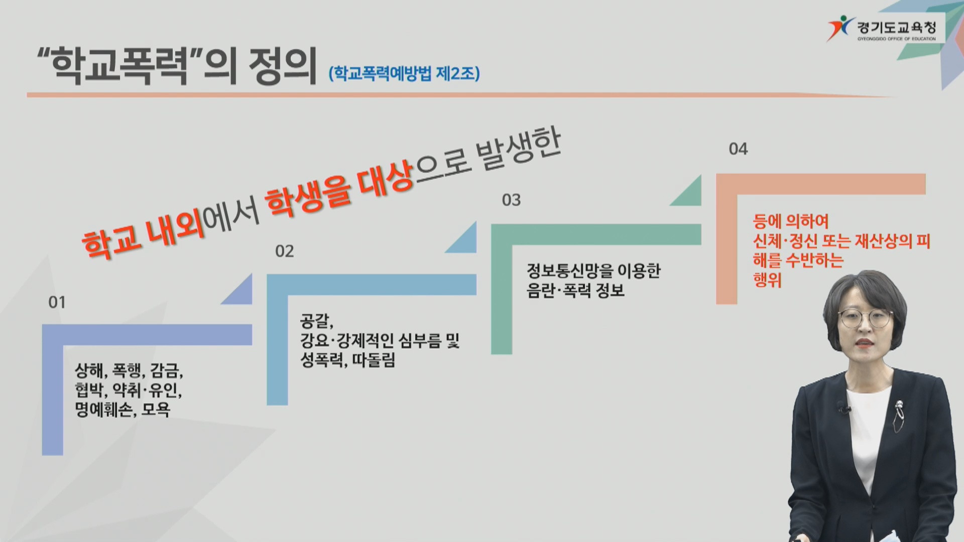 한편, 도교육청은 교육지원청별로 진행하는 학교폭력대책심의위원회 위원, 학교폭력 전담기구 구성원 대상 연수에 강사 인력을 지원하고 있다.