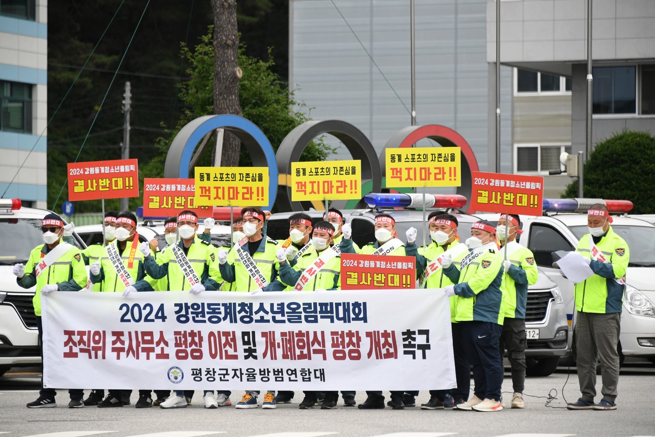 이날, 자율방범연합대는 동계스포츠의 자존심을 꺽지 말라는 팻말을 들고, “2018 평창 동계올림픽을 성공적으로 개최할 수 있었던 데에는 평창군민이 있었다”면서, “2024년 청소년동계올림픽 조직위 주사무소 평창 이전을 강력히 요구한다”고 말했다.