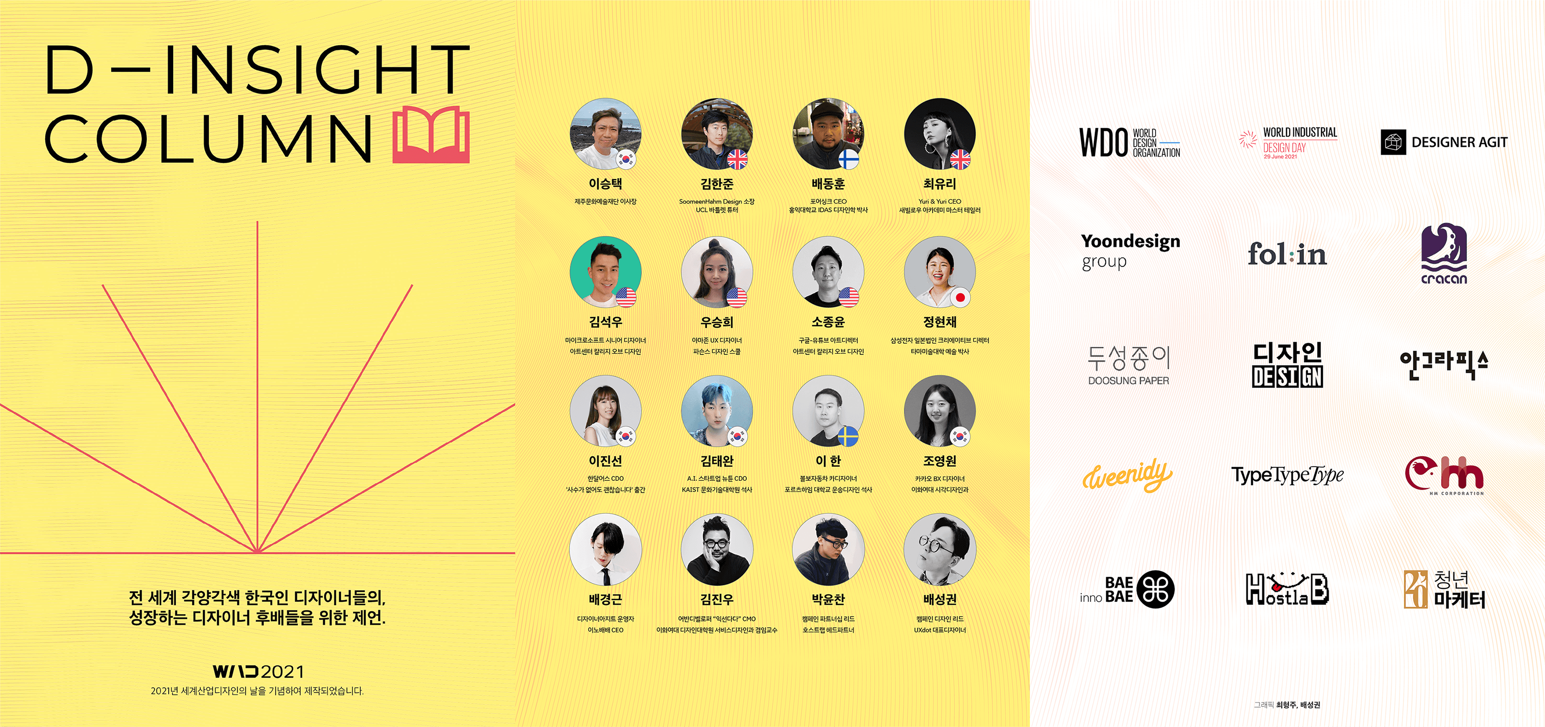 한편 이번 매거진은, ‘We Are Designers 2021’ 캠페인에 참여한 △윤디자인(엉뚱상상) △월간디자인 △안그라픽스 △중앙일보 폴인 △두성종이 △크라캔 △에이치엠 △위니디 △이노배배 △TypeTypeType △청년마케터 △호스트랩이 한국의 산업 디자이너 생태계를 지원하기 위해 자사 서비스와 디자인 서적 등을 일부 후원하는 것으로 알려져 있다.