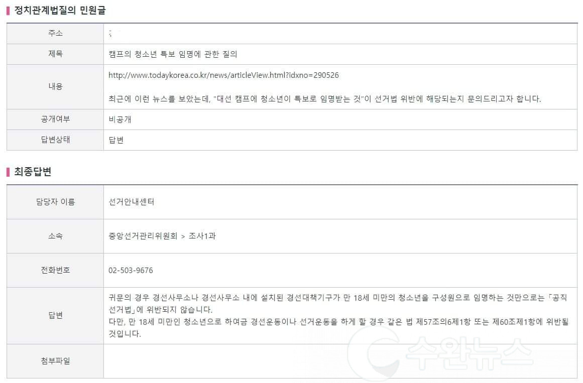 본 기자가 직접 중앙선관위에 질의한 결과는 위 사진의 내용과 같다. 결과적으로 놓고 보면 이낙연 대선후보 경선캠프에서 임명된 만 17세 청소년 조직 특보는, 중앙선관위의 답변에 따르면, 현행 공직선거법에 걸릴 여지가 없는 합법적으로 이뤄진 특보 임명인 것으로 보여진다. 다만, 만 18세 미만의 청소년이 경선운동이나 선거운동을 하게 될 경우에는 같은 법 제57조의 6제1항 또는 제60조제1항에 위반될 수 있다.
