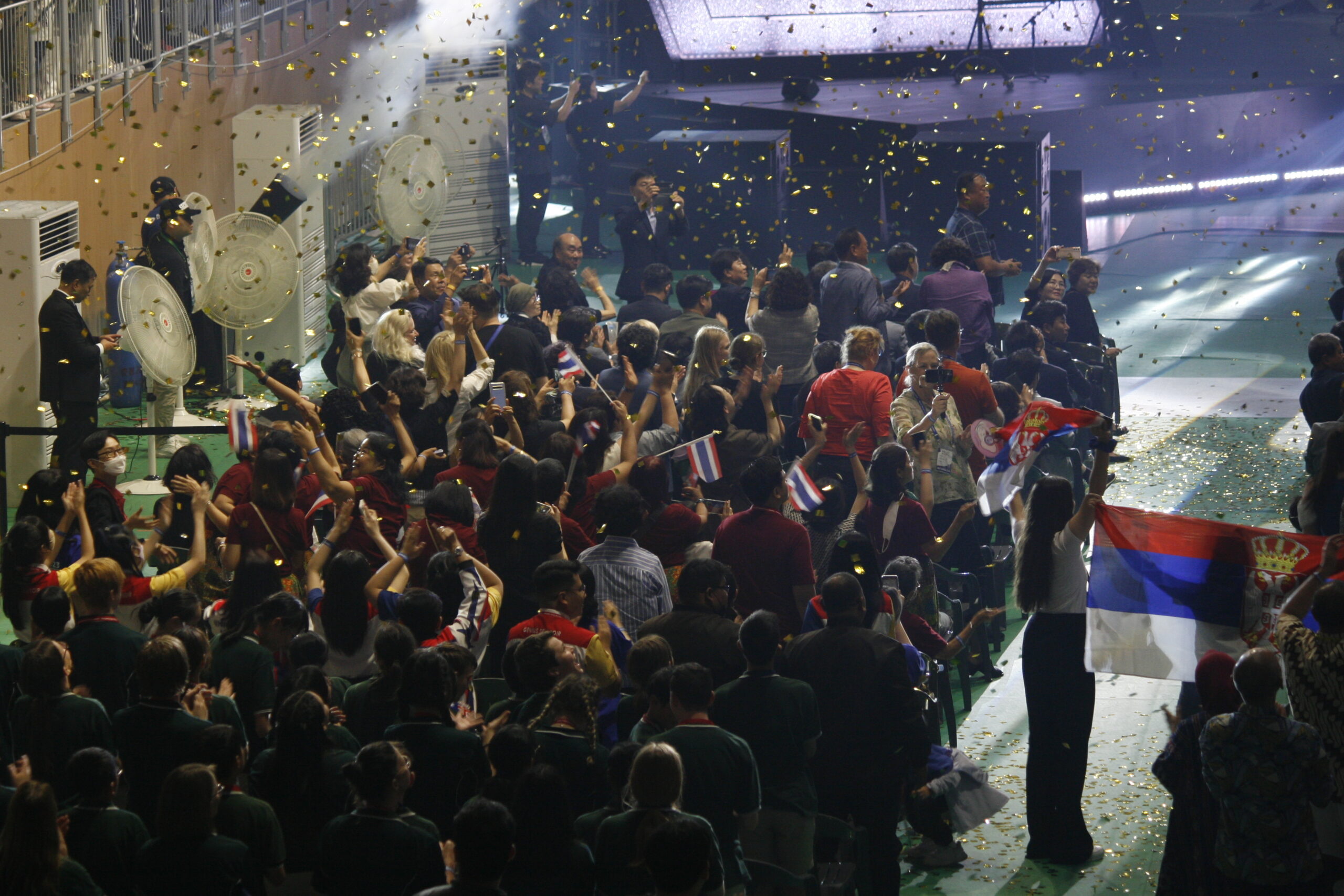 [수완뉴스=김동주 기자] 3일 강릉 아레나에서 열린 세계합창대회 개막식에서 흥겨운 개막 축하공연에 깃발 흔들며 환호하는 참가국 합창단의 모습이다.