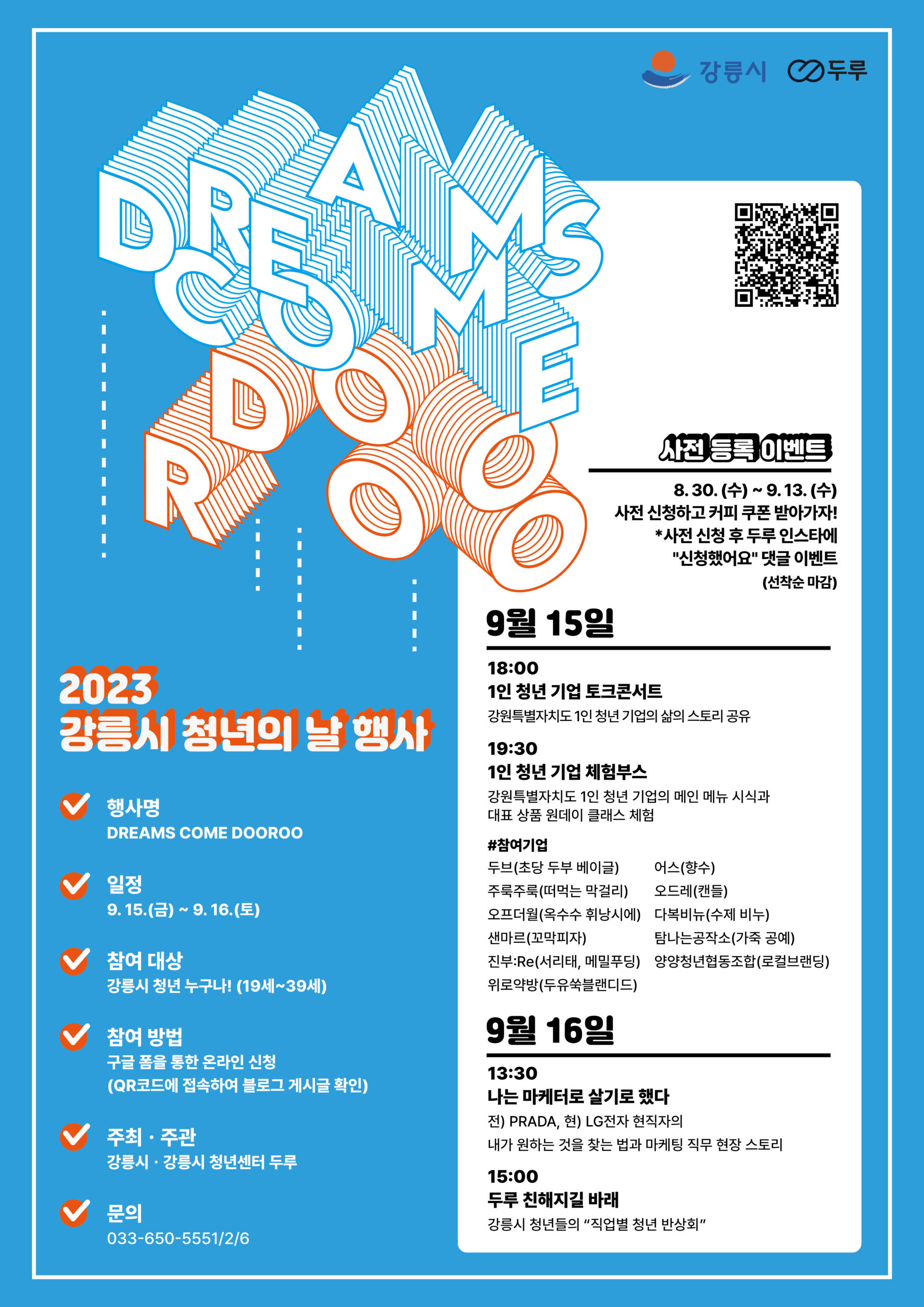 [수완뉴스=김동주 기자] 강릉시 청년센터 두루가 오는 15일부터 16일부터 ‘2023 청년의 날 기념 행사’를 개최한다. 청년의 날은 정부가 청년의 권리와 청년정책의 중요성에 대한 인식을 높이기 위하여 매년 9월 셋째 주 토요일에 지정하는 행사이다.