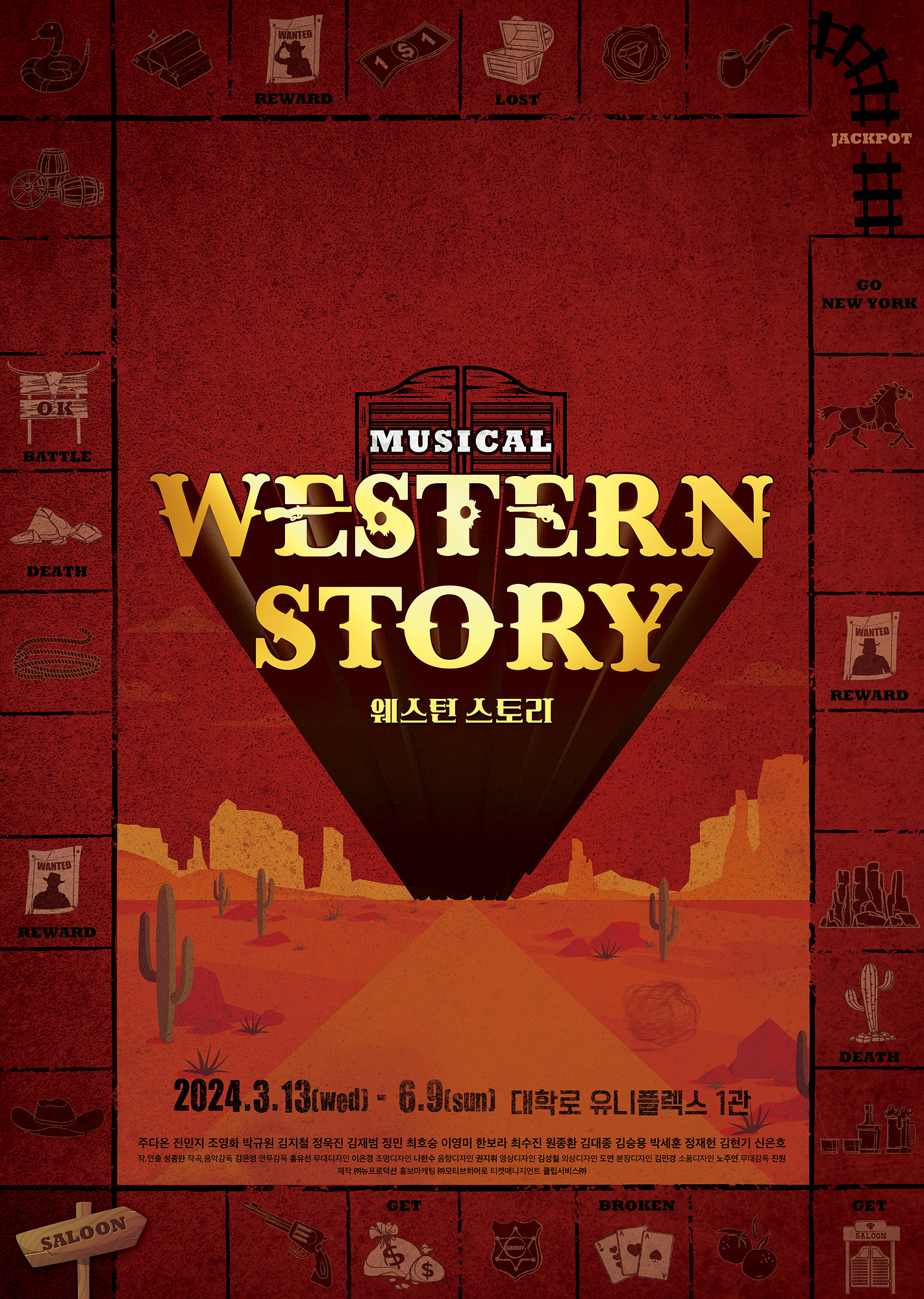 주다온, 전민지, 조영화, 박규원, 김지철, 정욱진, 김재범, 정민, 최호승, 이영미, 한보라, 최수진, 원종환, 김대종, 김승용, 박세훈, 정재헌, 김현기, 신은호 등 개성 넘치는 배우들이 새롭게 그려낼 뮤지컬 <웨스턴 스토리>는 오는 3월 13일 대학로 유니플렉스 1관에서 개막한다. 현실의 근심과 걱정을 잠시 잊고 웃을 수 있는 다이아몬드 살롱이 다시 한번 문을 열고 꿈과 낭만을 함께 즐길 관객을 맞이할 예정이다.
