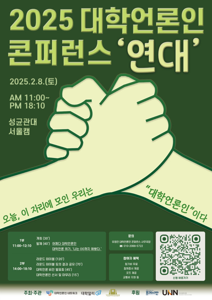 [수완뉴스=김동주 기자] 대학언론인 네트워크, 대학알리, 서울권대학언론연합회가 주최하고 한국대학신문과 프레시안이 후원하는 ‘2025 대학언론인 콘퍼런스: 연대’가 오는 8일 성균관대학교 서울캠퍼스 퇴계인문관에서 열린다. 대학언론인 콘퍼런스는 지난해 1월 열린 ‘2024 대학언론인 콘퍼런스:불씨’에 이어 2회째를 맞는다.