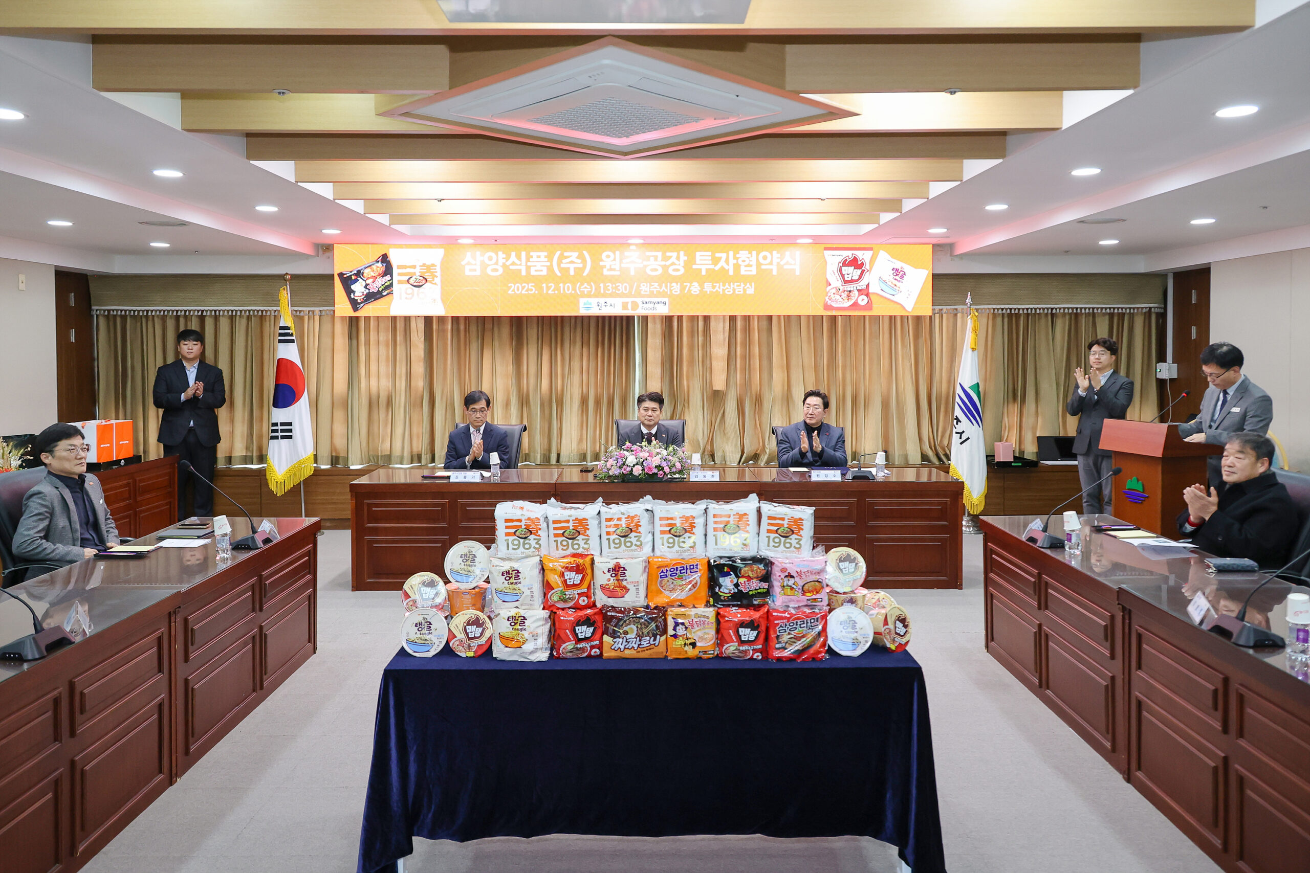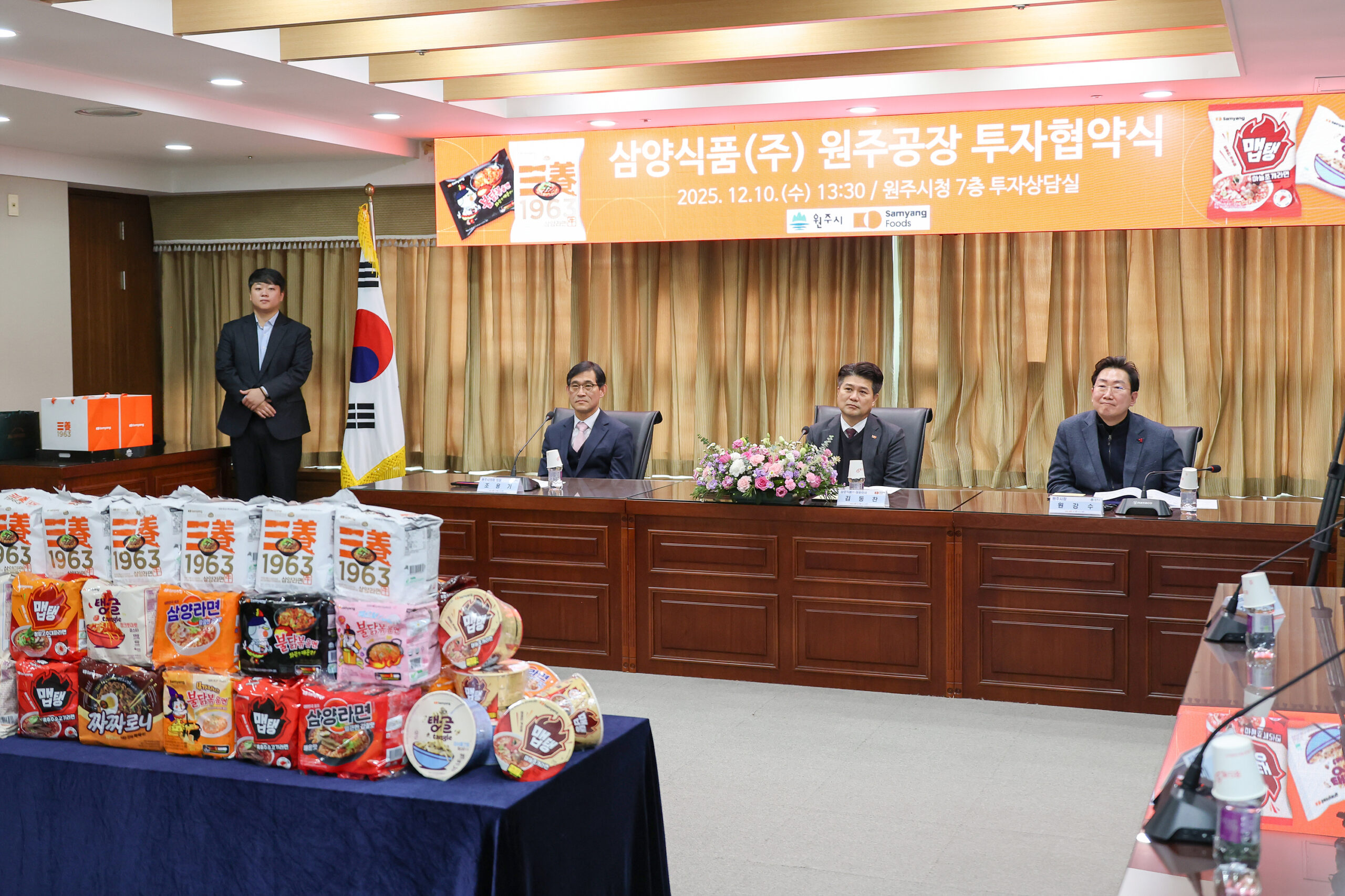 포토 일반사회수완뉴스 포토[사진] 삼양식품, 원주공장 투자 협약식 개최By Kim Tongjoo - 2025년 12월 10일0공유하다Email인쇄LINENaverFacebookTwitterWhatsAppTelegram ▶ 포스트 듣기 음성을 생성하는 중...[수완뉴스=김동주 기자] 삼양식품이 원주시청에서 액상스프 제조 공장 신설을 위한 780억 투자 협약식을 10일 개최했다. 투자 협약은 2027년 상반기까지 이행할 예정이며, 삼양식품의 이번 투자로 원주시의 고용창출은 90명 늘어날 전망이다.김동주 기자