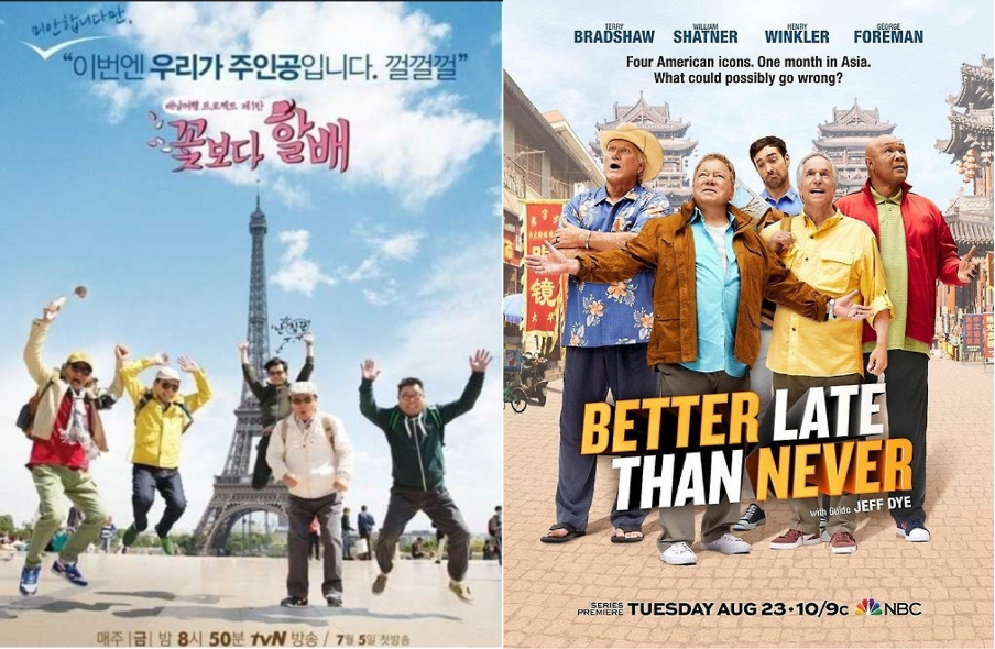 한국 <꽃보다 할배>와 미국판 꽃보다 할배 <Better Late Than Never>의 공식 포스터