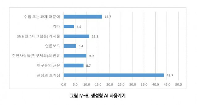 우선, 청소년들의 AI 사용 시간이 생각보다 길지 않다는 점은 주목할 필요가 있다. 관련 조사에 따르면 하루 평균 AI 사용 시간은 약 30분 수준에 불과하다. 오히려 대부분의 시간은 게임이나 유튜브 숏츠, 인스타그램 릴스, 틱톡과 같은 숏폼 콘텐츠 소비에 사용된다. 이는 ‘AI 과의존’이라는 문제 제기가 현실보다 과장되어 있을 가능성을 보여준다.